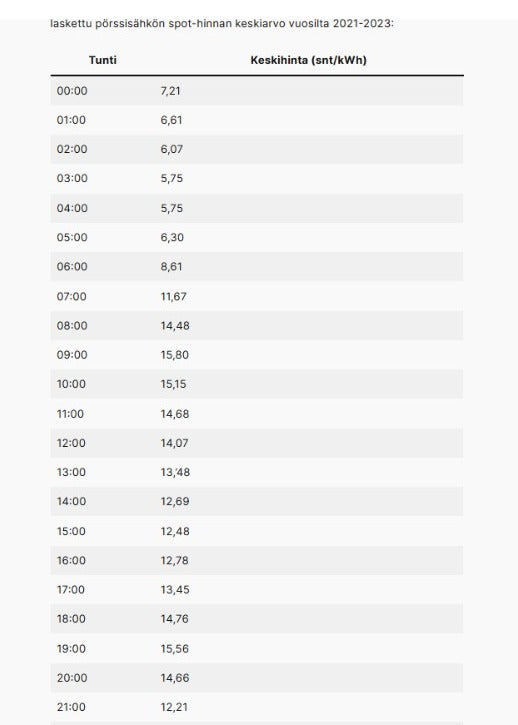Tilastosta nähdään, että yön ja aamun tuntien välinen vaihtelu on noin 10-11 senttiä kWh. Tällöin: