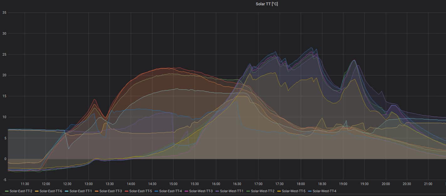 Nyt kun tuo katto on tuottanut pari kuukautta energiaa ei voi kuin ihmetellä tuloksia. Esimerkiksi 18.10.2020 katto tuotti 7,5 tuntia 15-27 asteista nestettä ulkolämpötilan ollessa 1.6 astetta. Vielä marraskuun puolivälissäkin tuottoa on saatu yli 7 tunnin ajan monena päivänä. Lämpötilat ovat olleet tällöin vain hieman matalampia 5-22 asteen välillä. Kuvaajista nähdään, kuinka tuotto on ensin tapahtunut rakennuksen itälappeella länsilappeen esilämmittäessä nesteen ja siirtynyt siitä länsilappeelle, jolloin itälape on toiminut esilämmittäjänä.